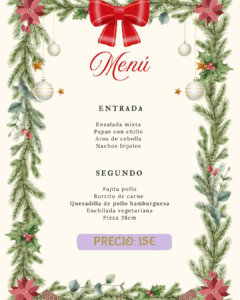 Incluye entrada, segundo, postre, café y bebida (no alcohólica).