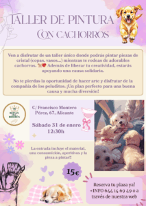 Te invitamos a vivir un taller de pintura en cristal con cachorros en Alicante, una experiencia creativa y solidaria donde podrás pintar piezas de cristal como copas o vasos mientras compartes un rato muy especial rodeado de adorables peluditos.