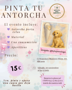 Durante la actividad, decoraremos una antorcha porta velas como la del cartel. Cada participante tendrá su propia antorcha y el vaso de cristal incluido, para pintarla y diseñarla con su estilo: