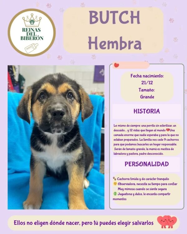 Butch necesita un poco más de tiempo para confiar. Pero cuando lo hace… se convierte en una perrita increíblemente mimosa. Es dulce, juguetona cuando se siente segura y profundamente leal.