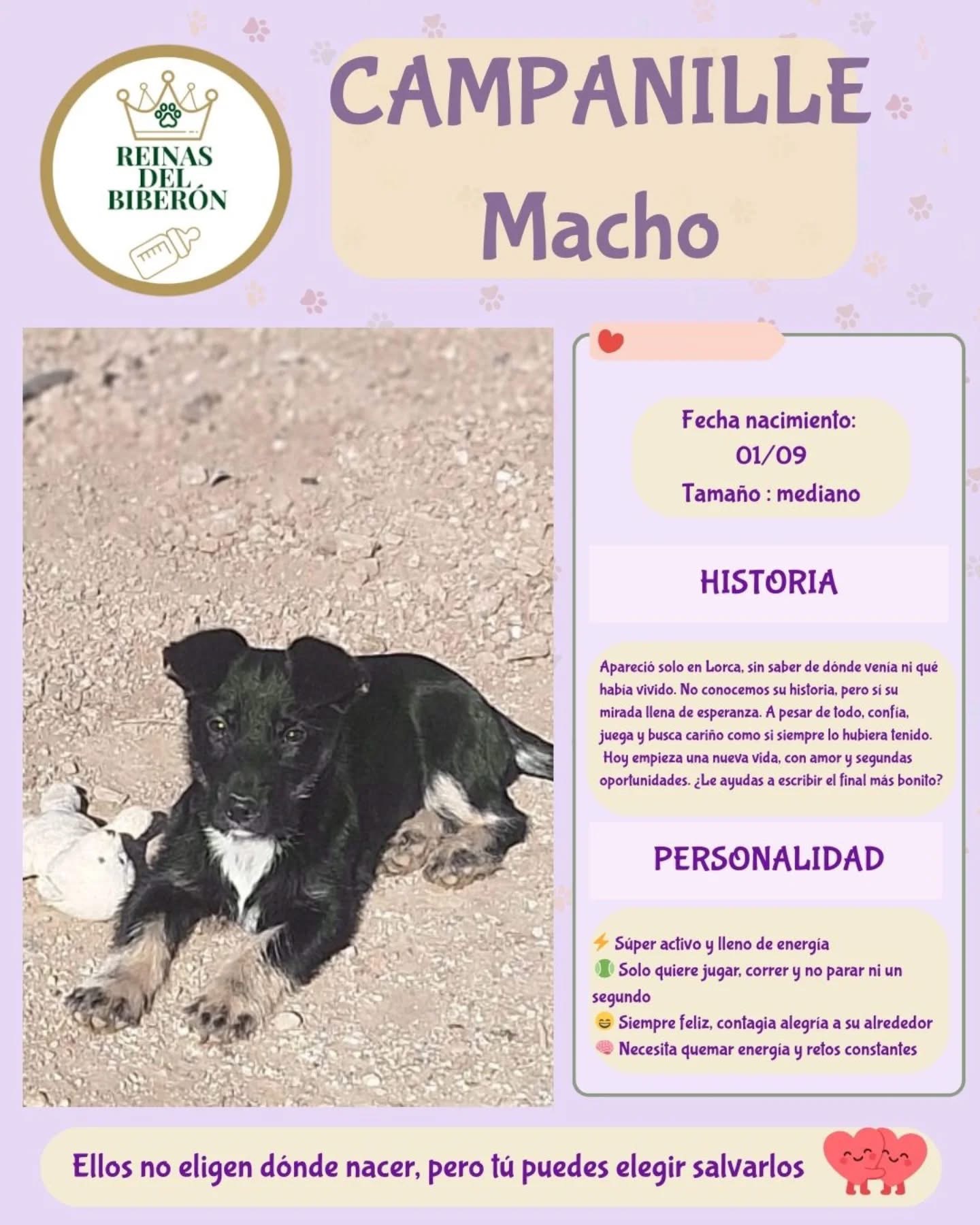 Campanille apareció solo, sin que sepamos su pasado, pero con una mirada llena de esperanza. A pesar de todo, es un cachorro feliz, activo y muy confiado.