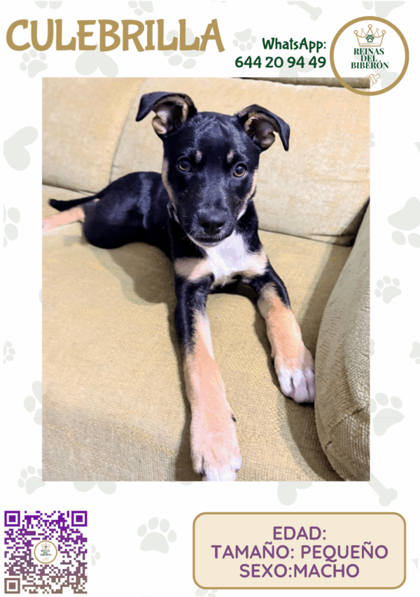 Culebrilla es un cachorrito que llegó a nosotros desde Murcia, con un pasado desconocido y un futuro por escribir. Cuando le vimos por primera vez, tenía esa mezcla de inocencia y alerta que solo muestran los perros que han tenido que aprender rápido para sobrevivir. Aun así, desde el primer momento dejó claro que su corazón era mucho más grande que sus miedos.