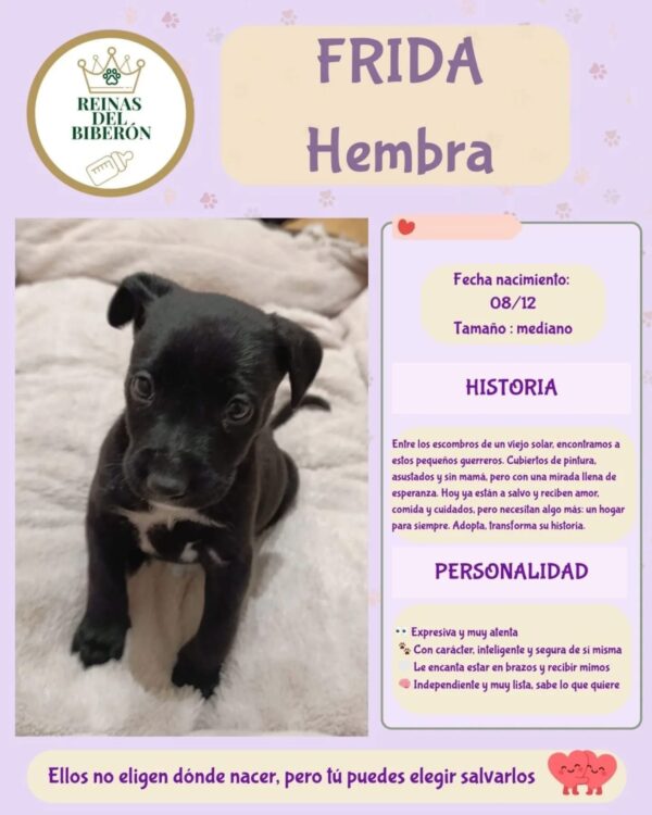 Frida sueña con un hogar donde crecer tranquila, donde sus ojitos no vuelvan a mirar con miedo, sino con confianza. Un hogar donde pueda sentirse querida para siempre y demostrar todo el amor que guarda dentro. Adoptar a Frida no es solo darle un futuro: es permitirle cerrar un pasado difícil y empezar de verdad a vivir.