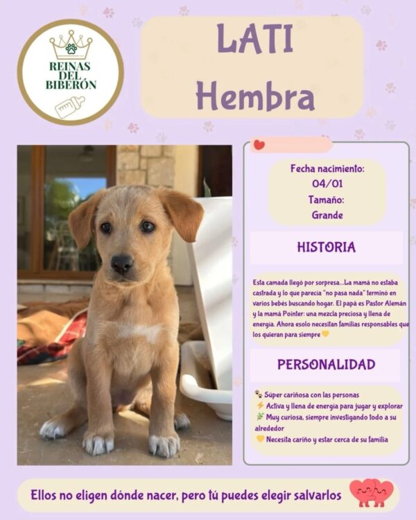 Lati es ideal para alguien que busque una compañera leal, cercana y muy afectuosa. Una perrita que crecerá contigo y para ti.