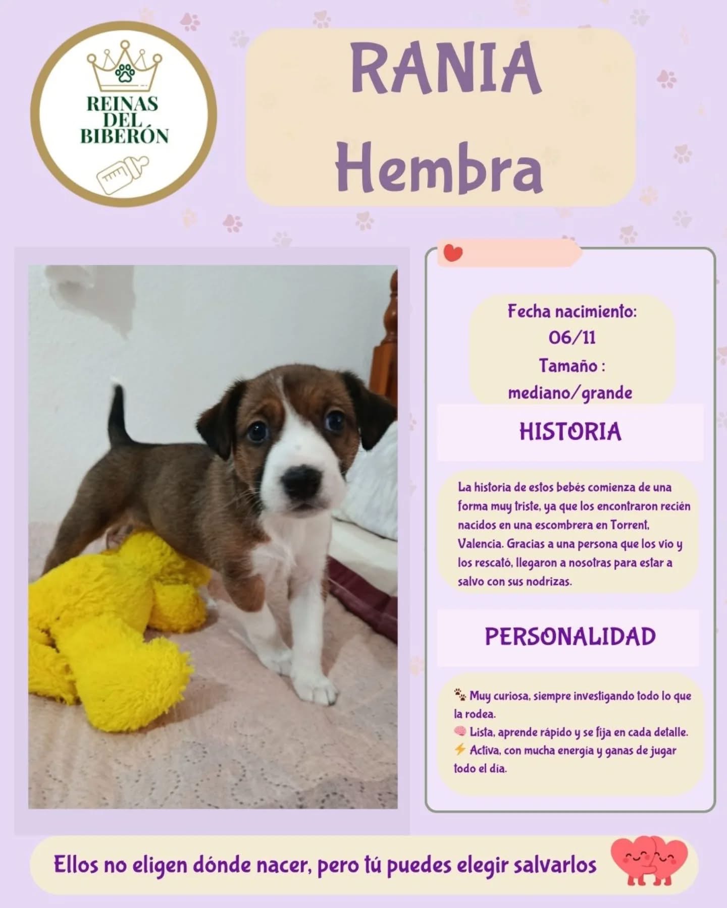 Rania es una cachorra muy curiosa, siempre pendiente de todo lo que ocurre a su alrededor. Observa, investiga y aprende rápido, demostrando una inteligencia y una energía que sorprenden para alguien que empezó su vida en circunstancias tan duras. Es activa, despierta y con muchas ganas de jugar y descubrir el mundo.