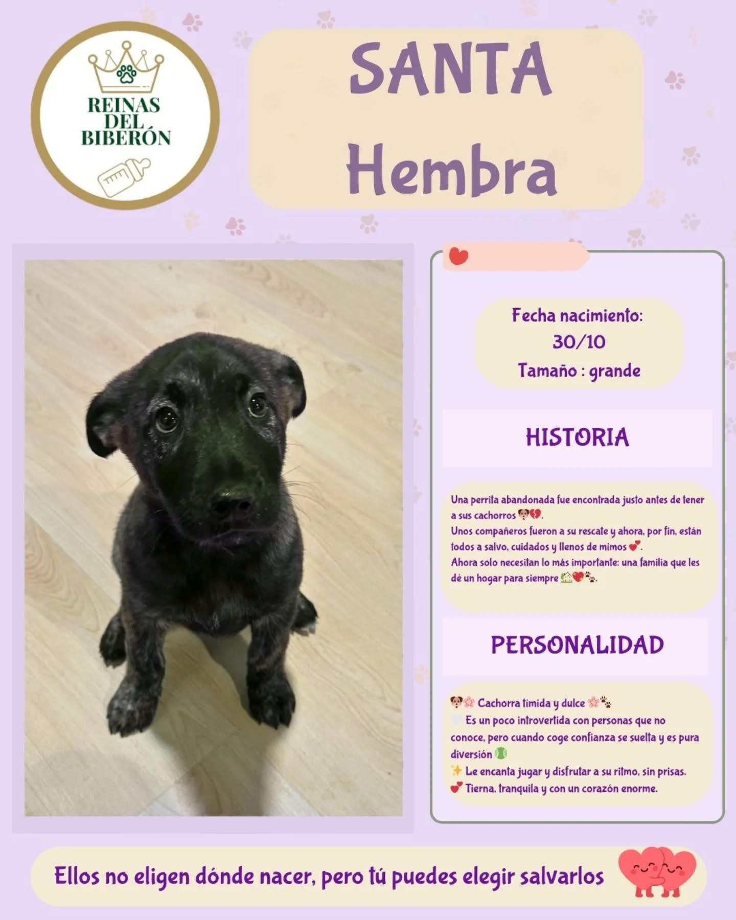 Santa es una cachorra tímida y muy dulce. Al principio puede mostrarse reservada con quienes no conoce, pero cuando gana confianza, se suelta y saca su lado más juguetón y divertido.