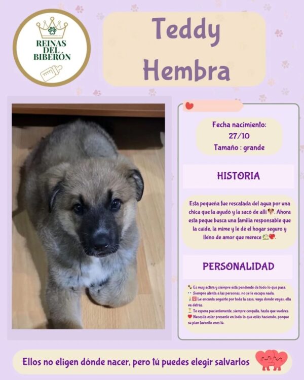 Ahora Teddy busca una familia responsable que la cuide, la mime y le dé el hogar seguro y lleno de amor que merece. Porque después de todo lo que ha pasado, Teddy solo quiere algo muy sencillo: no volver a sentirse sola nunca más.